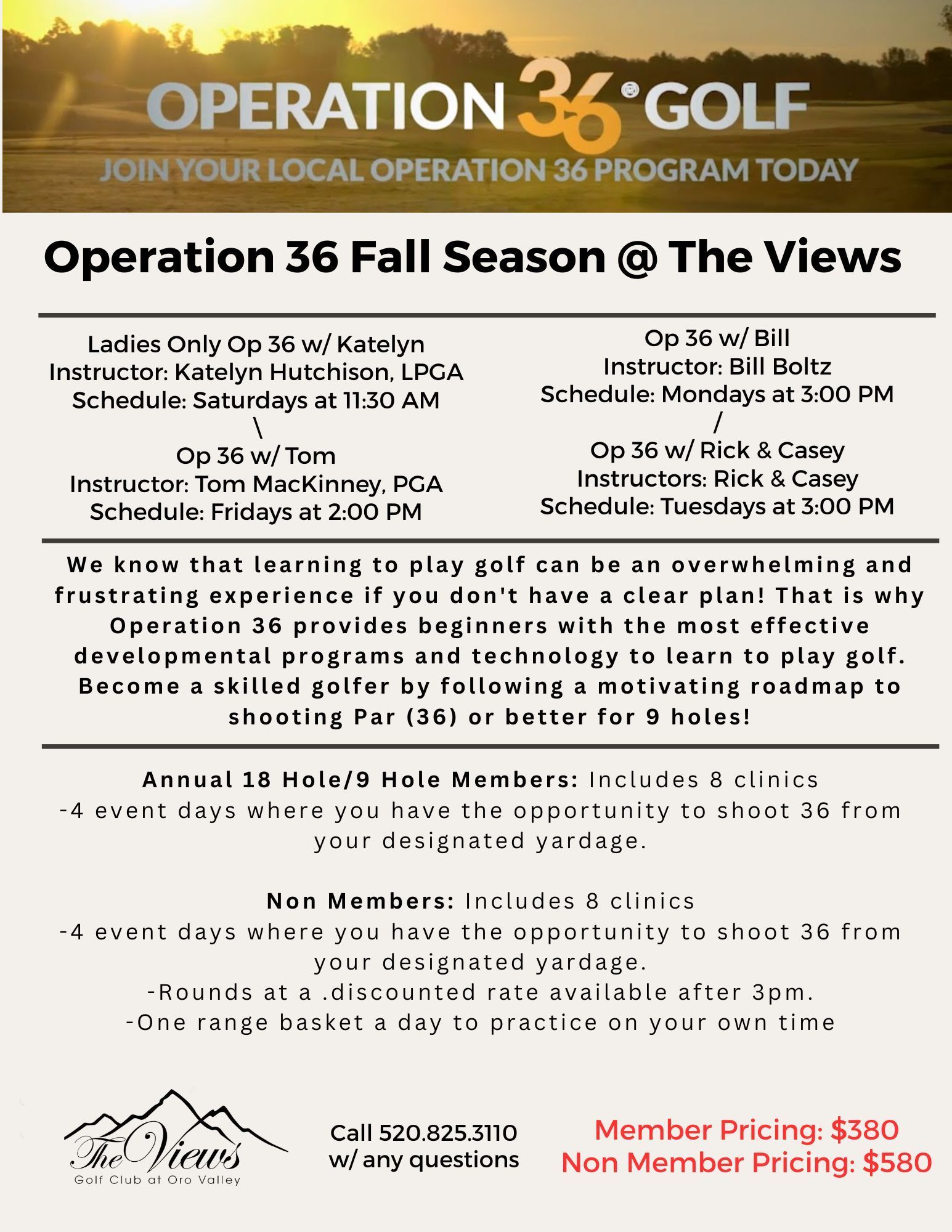 Most golf programs are incomplete. That is why The Views Golf Academy uses the Operation 36 Development Model with centers around golf. The goal is to help you shoot par 36 or better for 9 holes.